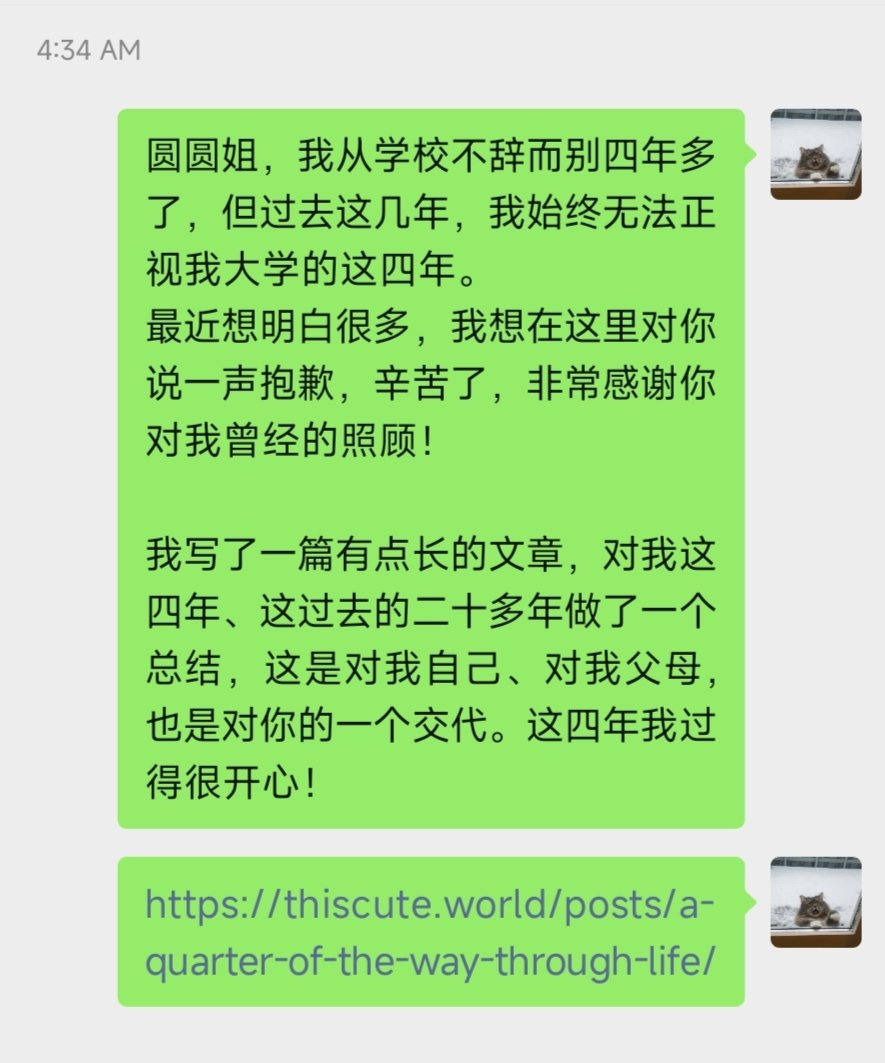 四年多前,我从学校不辞而别,我欠我的导员圆圆姐一个道歉,一份感谢,一个交代。这次,我也会一并补上已经补上了: